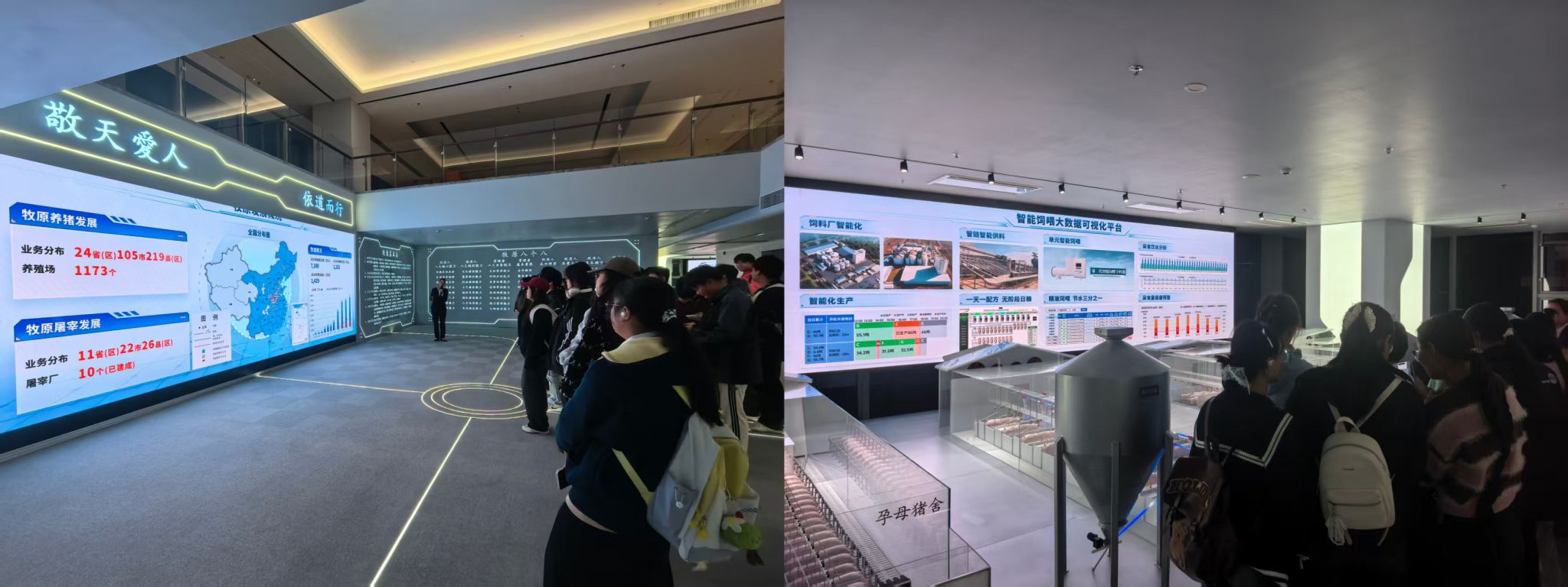 结束育种中心行程后,师生转赴郑州牧原大厦。在智能装备展厅,牧原集团集中展示了智能饲喂、环境调控、绿色循环等环节的前沿装备,融合物联网、人工智能等新一代信息技术的系统解决方案,不仅彰显了企业在智慧畜牧领域的创新实力,也启发了同学们对未来饲料工程智能化、绿色化转型的深入思考。