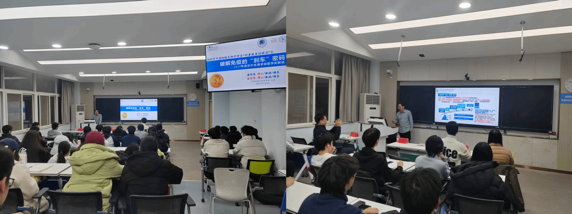 蓝贤勇教授,为饲料工程专业本科生做题为《破解免疫的“刹车”密码—2025年诺贝尔生理学或医学奖解读》的科普报告。本次报告由动物科学系主任乔汉桢副教授主持。2024、2025级的饲料工程专业本科生及系青年骨干教师张雪蕾、张封东博士共同参与了报告,师生齐聚一堂,共同聆听前沿科学解读,彰显了我系对本科生科研启蒙与创新能力培养的持续重视。