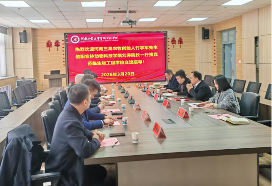 副院长刘涛、河南固佳食品有限公司总经理刘杨、河南固佳食品有限公司技术总监齐玉波、河南思辨商业管理有限公司董事长雷永辉一行就“黑猪产业液态发酵饲喂技术”来国产av影片寻求交流合作。国产av影片党委书记卫红伟、副院长梁赢、营养调控与饲料资源高效利用团队负责人张勇副教授及团队部分骨干教师共同参会。